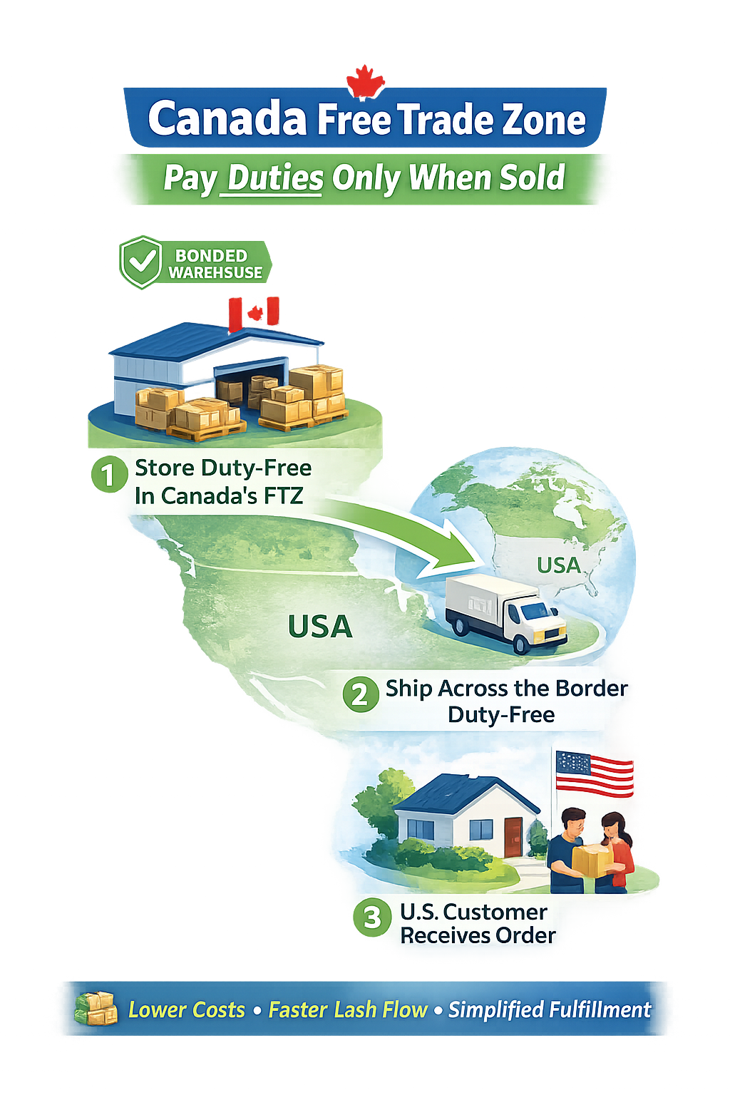 Store, process, and ship your inventory from Canada — without paying U.S. duties until it sells.