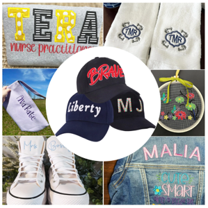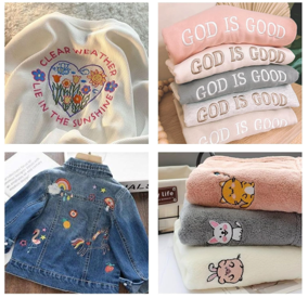 • We can embroider: Denim, canvas, leather, vinyl, hats, shoes, clothing, baby clothes, bags and anything that can be embroidered by industrial machines